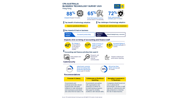 Media OutReach Newswire – 10 November 2025 – CPA Australia’s regional survey about business technology adoption shows that most companies in Hong Kong have used artificial intelligence (AI) tools at different levels. Though the increasing AI application helps to improve productivity, it also transforms the hiring trends in the accounting and finance industry, and increases concerns on data protection and governance, according to the survey findings.