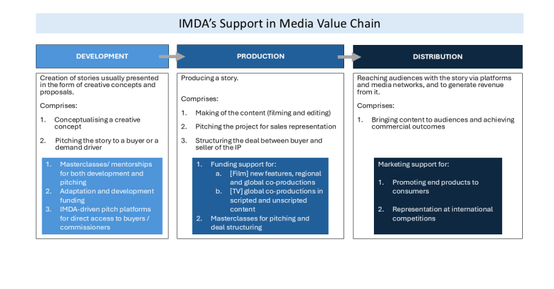 5. IMDA’s support in the media value chain for Singapore media professionals and companies is summarised in the diagram below.